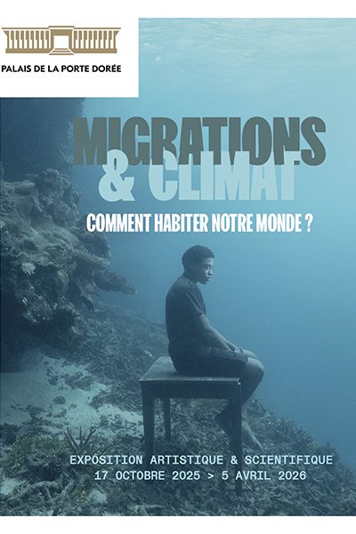 Du 17 octobre 2025 au 5 avril 2026, l’exposition Migrations & Climat explore les dynamiques des migrations humaines mais aussi du vivant liées au dérèglement climatique. Pour la première fois, le Palais de la Porte Dorée déploie dans l’ensemble de ses espaces, Musée et Aquarium, une exposition monde rassemblant plus de 200 photographies documentaires, œuvres d’art, témoignages, vidéos, infographies et installations pour une expérience de visite documentée, incarnée et sensible.